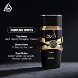 Asad by Lattafa Perfumes is a Amber fragrance for men. Asad was launched in 2021. Top notes are Black Pepper, Pineapple and Tobacco; middle notes are Patchouli, Coffee and Iris; base notes are Vanilla, Amber, Dry Wood, Benzoin and Labdanum.